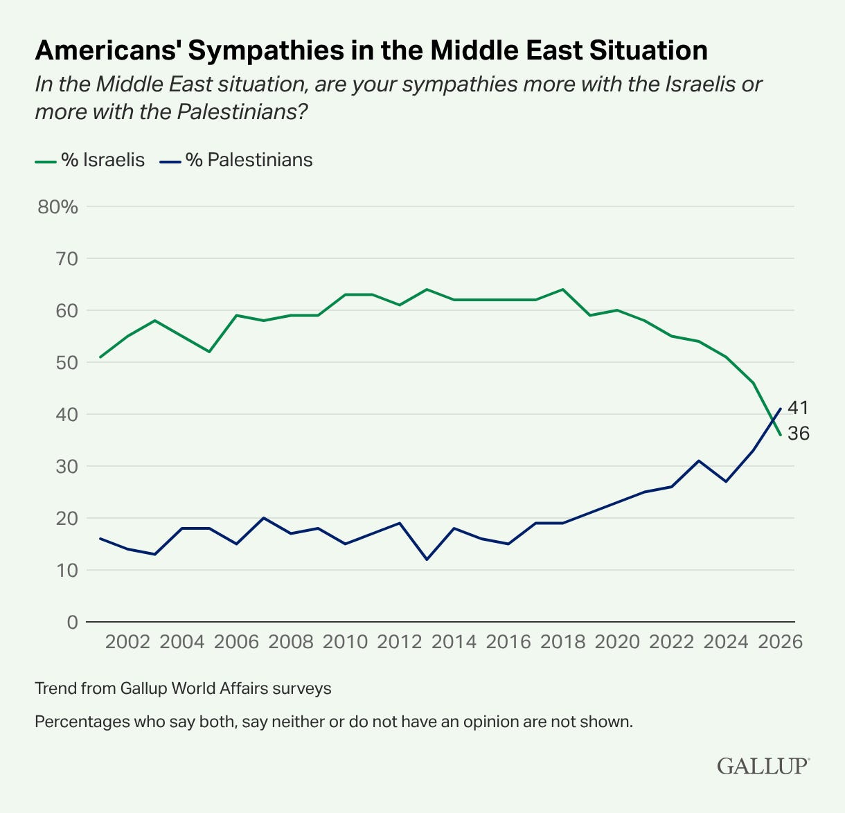 Israelis No Longer Ahead in Americans' Middle East Sympathies Benedict Vigers, Gallup Forty-one percent of Americans now say they sympathize more with the Palestinians in the Middle East situation, while 36% sympathize more with the Israelis. The five-percentage-point difference is not statistically significant, but it contrasts with a clear lead for the Israelis only a year ago (46% vs. 33%) and larger leads over the prior 24 years.