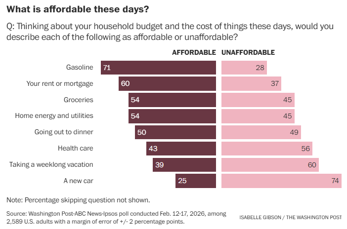 A new car, home feel out of reach for middle-class Americans, poll finds Lauren Kaori Gurley and Isabelle Gibson, Washington Post [unlocked] Health care, new cars and new homes feel unaffordable to most Americans, a Washington Post-ABC News-Ipsos poll shows. Most Americans say that they can afford basic necessities like their current housing costs, groceries, utilities and gasoline. But large numbers across income levels also say larger expenses and the cost of things associated with an enjoyable life — including taking a weeklong vacation — are out of reach.