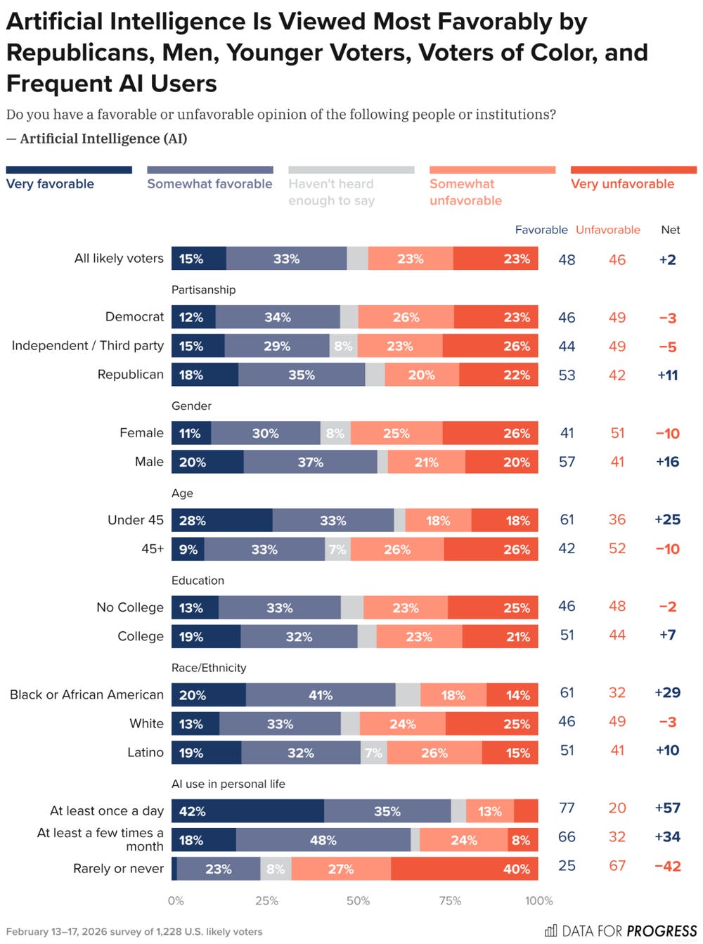 Public Opinion on Artificial Intelligence Varies Widely by Age, Gender, Race, and Frequency of Use Data for Progress In a new survey, Data for Progress asked voters how frequently they use AI in their daily lives, whether they have a favorable or unfavorable view of the technology, and how confident they are in their ability to spot AI-generated content when they encounter it online. The survey finds wide disparities in perceptions of and openness to AI across partisanship, gender, age, race, and frequency of AI use.