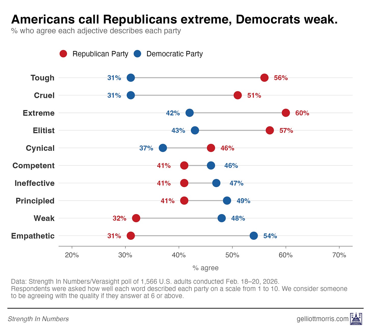 New poll: Democrats' real problem isn't being too liberal — it's being seen as too weak G. Elliott Morris, Strength In Numbers Americans, including swing voters, see the Republican Party as 20 points more extreme than Democrats — and the Democrats as weak and ineffective. So why would the *Democrats* moderate?