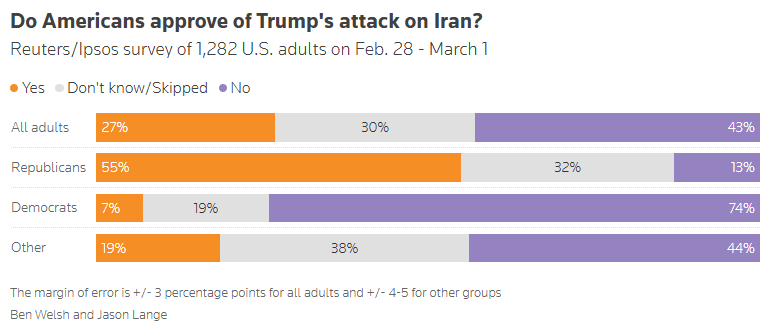 Just one in four Americans supports US strikes on Iran, Reuters/Ipsos poll finds Jason Lange, Reuters Only one in four Americans approves of the U.S. strikes that killed Iran’s leader, while about half — including one in four Republicans — believe President Donald Trump is too willing to use military force, according to a Reuters/Ipsos poll that concluded on Sunday.