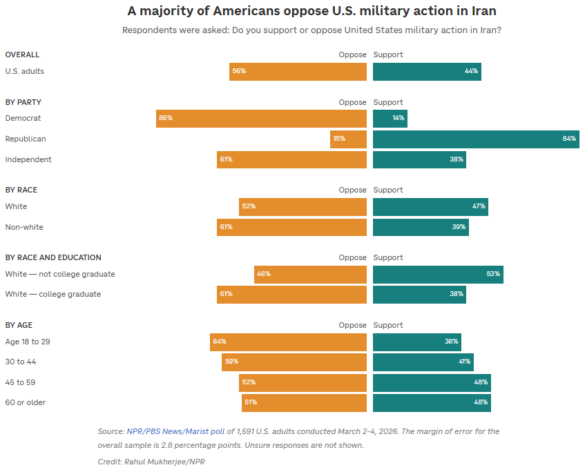 A majority of Americans opposes U.S. military action in Iran Domenico Montanaro, NPR News As war with Iran heads toward a second week, most Americans say that they are against the military action and disapprove of how President Trump is handling it, according to the latest NPR/PBS News/Marist poll.
