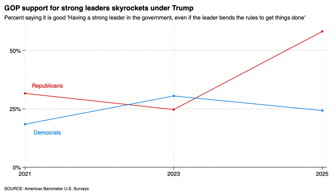 More Republicans now support “strong leaders” who “bend the rules” John Sides (Vanderbilt University), Good Authority New survey data shows again how partisanship weakens a commitment to democracy.