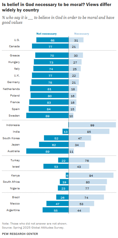 In the U.S. and other countries, fewer people now say it’s necessary to believe in God to be moral Jonathan Evans, Pew Research Center Do you need to believe in God to be moral and have good values? Views on this question vary widely around the world, according to a 2025 Pew Research Center survey of 25 countries.