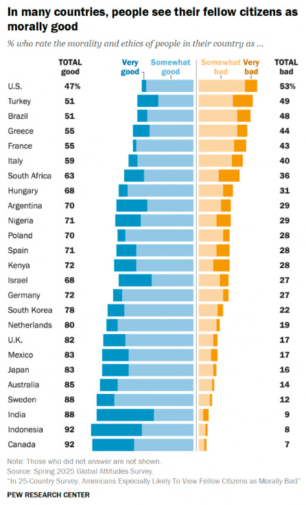 In 25-Country Survey, Americans Especially Likely To View Fellow Citizens as Morally Bad Pew Research Center We asked people around the world to rate the morality and ethics of others in their country. The United States is the only place we surveyed where more adults (ages 18 and older) describe the morality and ethics of others living in the country as bad (53%) than as good (47%).