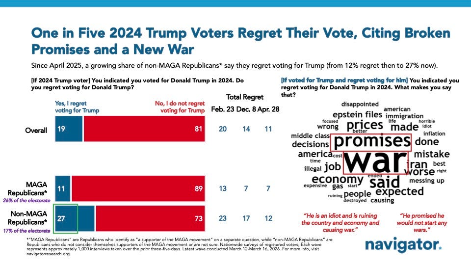 Visualizing the erosion of American democracy Philip Bump American democracy is still more robust than most other countries, including neighbors like Mexico. But while democracies in Europe have also seen backsliding, the extent of the U.S.’s recent shift is exceptional. Iran war shows how poll questions can distort public opinion in trying to report it Natalie Jackson (GQR Research), National Journal [unlocked] Voters' views are fluid, especially on emerging issues and complex legislation. Everyone but Trump Understands What He’s Done Anne Applebaum, The Atlantic [unlocked] Allied leaders know that any positive gesture they make will count for nothing. Rift Widens Among Republicans Over Israel and War in Iran Richard Fausset and Ken Bensinger, The New York Times [unlocked] As the U.S.-Israel-Iran war continues, conservatism’s most famous figures are in a rhetorical brawl over America’s role. How Much Pain Is Trump Really Willing to Endure? Jonathan Lemire and Nancy A. Youssef, The Atlantic [unlocked] The outcome of the war in Iran may come down to just how much risk he can take. The TACO trade meets the fog of war Nate Silver, Silver Bulletin Counting on Trump to "always chicken out" is a risky strategy. And war in the Middle East is a different game. Most Americans support requiring photo ID to vote. Democrats in Congress reject it. Sahil Kapur, NBC News As Republicans highlight the most popular policy in the SAVE America Act, Democrats say its other provisions would disenfranchise U.S. citizens and that photo ID rules are unnecessary. Jim Crow Redux: The “SAVE America” Act Is a Poll Tax, Plain and Simple Norman J. Ornstein, The New Republic Requiring people to shell out for passports and birth certificates to “solve” a problem that doesn’t exist is a modern-day version of what they used to do down South. It must be stopped. The “Save Trump Act” Markschulman’s Substack When All Else Fails…Disrupt the Midterms! Trump’s Gutting of Election Security Fuels Worries for Midterms Adam Sella, The New York Times [unlocked] Officials say the crippling of the Cybersecurity and Infrastructure Security Agency, which the president himself created, could open elections to cyberattacks and foreign influence. Trump’s Tariffs Will Loom Large Over the Midterms, Whatever Happens in Iran Shawn Donnan, Bloomberg Businessweek [unlocked] US history shows that duties have a way of boomeranging back on their backers at election time. Trump’s tariffs were supposed to help manufacturers. But instead, they’re hurting Josh Boak, The Associated Press Jay Allen is a fan of President Donald Trump, and voted for him on the belief that the Republican would cut taxes and trim regulations, helping his manufacturing business in northeast Arkansas. But the tariffs at the core of Trump’s economic agenda have wreaked havoc on his company. Allen’s experience embodies a growing body of evidence that the tariffs that Trump said would help American factories are, in fact, squashing many of them. Connecting the dots on the economy David Winston (The Winston Group), Roll Call The newest economic development facing the White House is the slowdown in job creation that cannot be ignored. ‘Surveil, Govern and Control’: What Could Go Wrong? Thomas B. Edsall, The New York Times [unlocked] As artificial intelligence — led by Nvidia, Microsoft, Alphabet, Meta, Amazon, OpenAI and Anthropic — drives to become the nation’s dominant industry, one of the most pressing questions is how technology is affecting, if not supplanting, politics, potentially diminishing the centrality of elections.