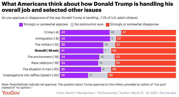 Trump is losing support from Independents over Iran David Montgomery, YouGov A majority of Americans continue to disapprove of how Donald Trump is doing his job as president, in line with trends from the past few months. In this week's Economist / YouGov Poll, 37% of Americans strongly or somewhat approve of Trump's job handling, while 56% disapprove — a net job approval of -18 after rounding.