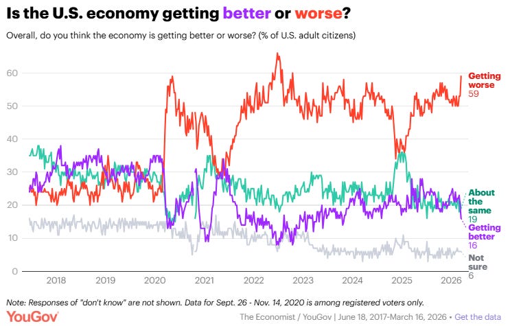 Americans suddenly are more likely to see the economy getting worse David Montgomery, YouGov With gas prices rising due to the U.S. conflict with Iran, Americans are quickly becoming more negative about the U.S. economy. This week's Economist / YouGov Poll finds 59% of Americans say the economy is getting worse, in response to a question asked almost every week since 2017. That's the highest share to say this on any Economist / YouGov Poll since October 2022, and is up from 53% last week.