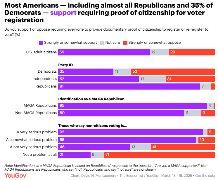 Most Americans support proof of citizenship to vote, but limiting use of mail-in ballots is more divisive David Montgomery, YouGov Americans are divided over whether non-citizens voting in U.S. elections is a serious problem, but most Americans strongly or somewhat support requiring proof of citizenship in order to register to vote, this week's Economist / YouGov Poll finds.