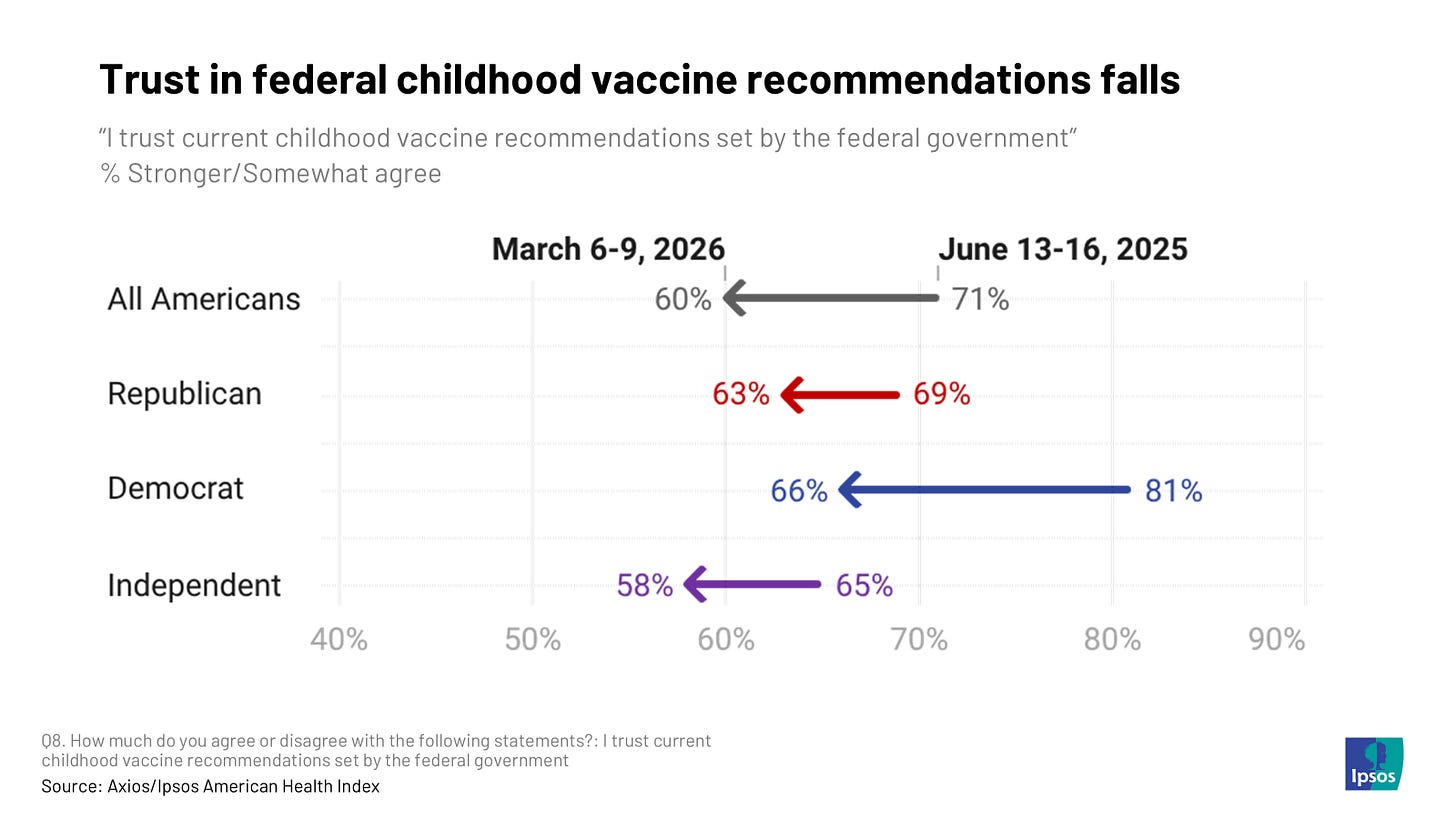 Axios-Ipsos poll: Americans distrust Trump vaccine policies Adriel Bettelheim and Margaret Talev, Axios Just 6 in 10 Americans now trust the government's vaccination recommendations for children, according to the Axios-Ipsos American Health Index, reflecting the dramatic erosion of public trust during the tenure of Health Secretary Robert F. Kennedy Jr. Iran further erodes Trump’s standing amid cost concerns Eli Yokley, Morning Consult Trump’s approval rating is stuck in negative territory: Voters are 11 points more likely to disapprove than approve of his job performance, marking a 3-point decline since before his strikes on Iran. Democrats hold a narrow 3-point edge over Republicans in Congress on the economy (44% to 41%), part of a broader erosion of Republican advantages across the issue trust board. March 2026 Verified Voter Omnibus Echelon Insights • Donald Trump’s job approval stands at 41% approve, 57% disapprove • Democrats lead on the 2026 generic congressional ballot, 49-44 • Voters disapprove of the US military operations against Iranian government, 49-43, while 64% say Iran poses a very or somewhat serious threat to the US • Voters say AI will be helpful rather than hurtful on balance for humanity, 39-36, with 25% unsure
