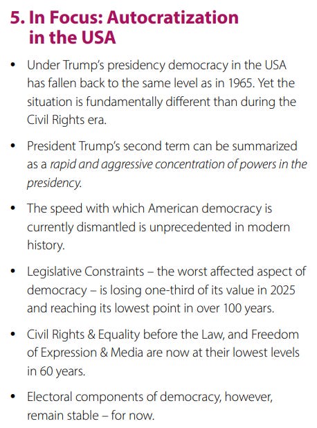 Democratic Backsliding Reaches Western Democracies, with U.S. Decline “Unprecedented” V-Dem Institute at the University of Gothenburg Democratic backsliding is now happening in well-established democracies. Democracy in the USA is deteriorating at unprecedented speed, and media and journalists are increasingly targeted across the world. This, and more, is reported in the latest Democracy Report from the V-Dem Institute at the University of Gothenburg.