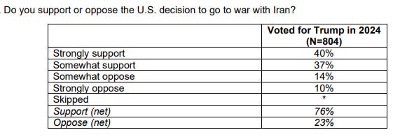 Poll of Trump voters on the war in Iran Alec Tyson and Ryan Tully, Ipsos A new Quincy Institute and The American Conservative poll conducted by Ipsos explores attitudes towards the U.S. decision to go to war in Iran among Americans who voted for Donald Trump in the 2024 election.
