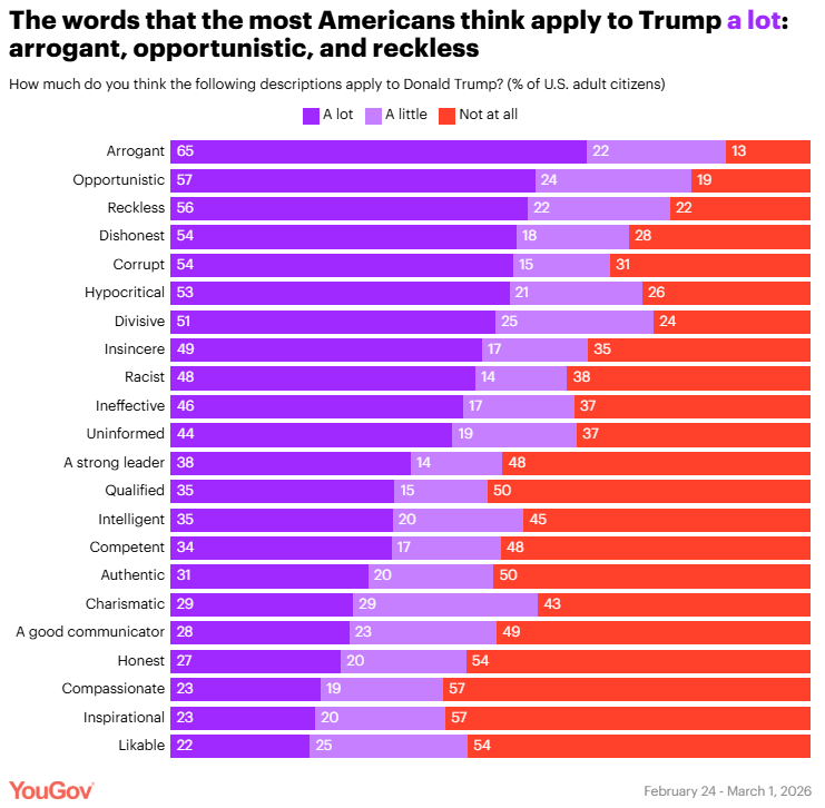 Trump Voters Back War but Favor Quick Exit Joseph Addington, The American Conservative A new Ipsos poll commissioned by The American Conservative and the Quincy Institute for Responsible Statecraft shows that 2024 Trump voters support the decision to go to war in Iran but oppose an American invasion of the country and would favor quickly ending the conflict. Majorities of Americans think Donald Trump is arrogant, opportunistic, and reckless Jamie Ballard, YouGov A new YouGov survey asked Americans which descriptors apply to Donald Trump, which issues they trust him to handle, and how democracy is functioning in the U.S. The survey also found that many Americans see economic collapse and civil war in the not-too-distant future for the U.S.