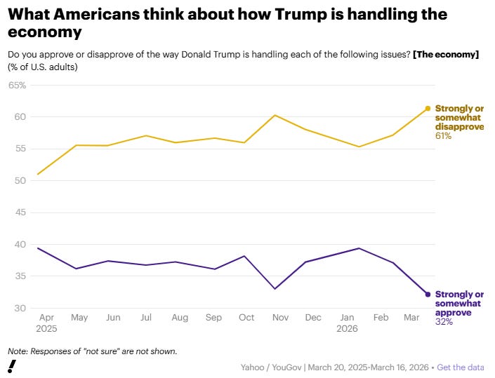 66% of Americans disapprove of Trump on gas prices as they feel effects of Iran war Andrew Romano, Yahoo News A new Yahoo/YouGov survey finds the president's economic approval rating at an all-time low.