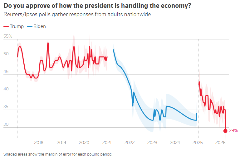 Trump's approval hits new 36% low as fuel prices surge amid Iran war, Reuters/Ipsos poll finds Jason Lange and Bo Erickson, Reuters President Donald Trump's approval rating fell in recent days to its lowest point since he returned to the White House, hit by a surge in fuel prices and widespread disapproval of the war he launched on Iran, a Reuters/Ipsos poll found. Only 29% of the country approves of Trump's economic stewardship, the lowest rating in either of Trump's presidential administrations and lower than any economic approval rating of his predecessor, Democrat Joe Biden.