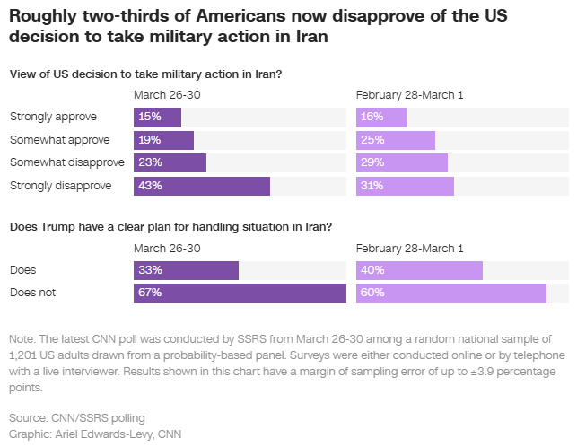 What Americans think about Donald Trump’s Iran strategy Ariel Edwards-Levy, CNN Just 34% of Americans now say they approve at least somewhat of the US decision to take military action in Iran, down 7 points from a CNN poll conducted just after the start of the war. Disapproval has risen to 66%, with strong opposition climbing 12 points to 43%.