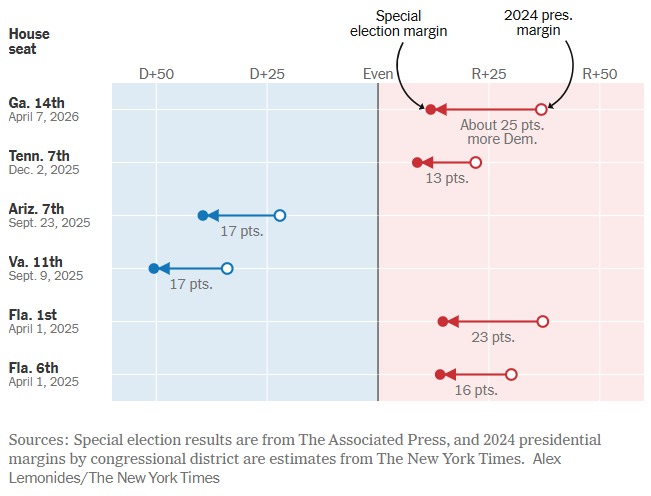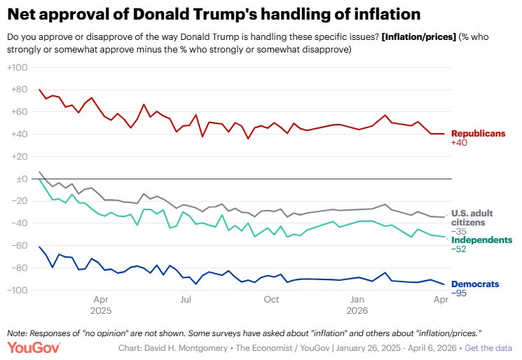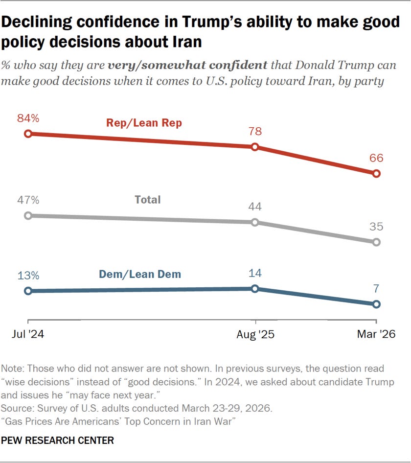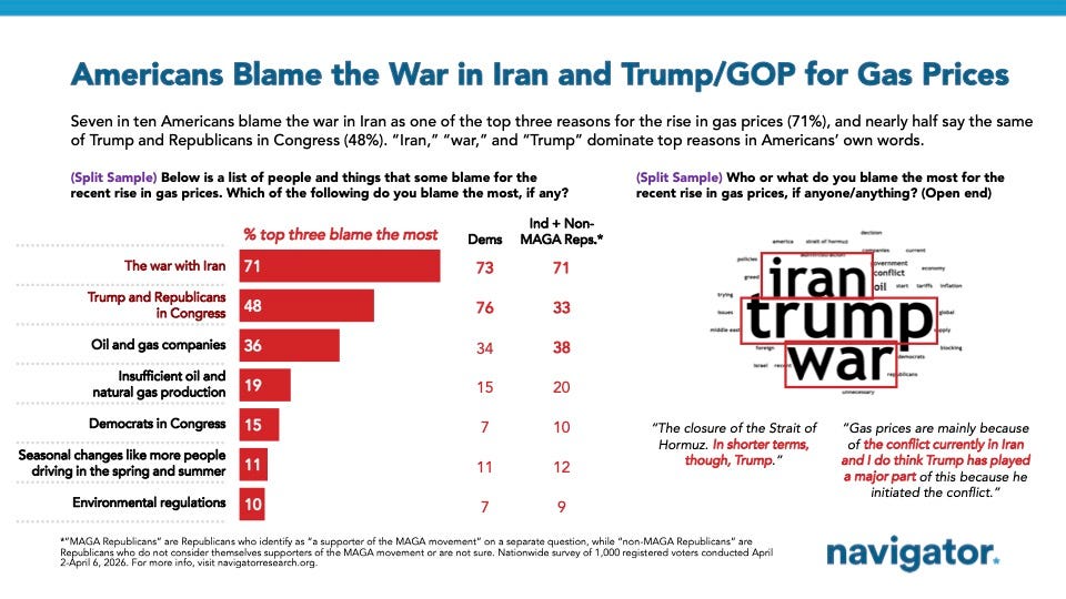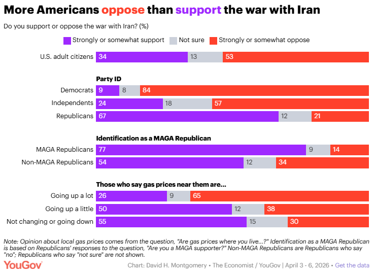 Trump is losing the public over Iran G. Elliott Morris, FiftyPlusOne Approval how how he's handling foreign policy, prices, and the presidency in general has fallen in the wake of the conflict Opinion of the Iran War in Wisconsin Charles Franklin, PollsAndVotes Most groups oppose the war; Trump loyalists approve How Trump Took the U.S. to War With Iran Jonathan Swan and Maggie Haberman, The New York Times [unlocked] In a series of Situation Room meetings, President Trump weighed his instincts against the deep concerns of his vice president and a pessimistic intelligence assessment. Here’s the inside story of how he made the fateful decision. The Illiteracy of the Trump Administration Daniel W. Drezner, Drezner’s World What happens when U.S. foreign policy is run by faux intellectuals rather than people who have actually read things? Nuclear brinkmanship usually works. It’s also incredibly dangerous. Nate Silver, Silver Bulletin A small chance of a catastrophic outcome isn’t something to shrug off. Dozens of Democrats call for Trump's removal after his Iran threats Raquel Coronell Uribe and Kyla Guilfoil, NBC News The Democratic lawmakers on Capitol Hill backed steps like impeachment and removing the president via the 25th Amendment, even after Trump's ceasefire announcement. Why Gas Prices Hit Different Julian Zelizer, The Long View When Voters Can’t Trust What They Read and Hear, They Trust What They Pay Democrats Pulled Off Their Biggest Shift Yet Among House Specials Since 2024 Caroline Soler and Christine Zhang, The New York Times [unlocked] Shawn Harris lost by about 12 percentage points in the 14th Congressional District, but he shifted the district 25 points to the left.