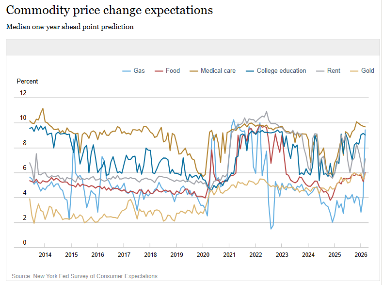 Short-Term Inflation Expectations Increase as Gas Price Growth Expectations Spike Federal Reserve Bank of New York The Federal Reserve Bank of New York’s Center for Microeconomic Data today released the March 2026 Survey of Consumer Expectations, which shows that households’ inflation expectations increased at the short- and medium-term horizons and remained unchanged at the longer-term horizon. Gas price growth expectations surged to the highest level since March 2022.