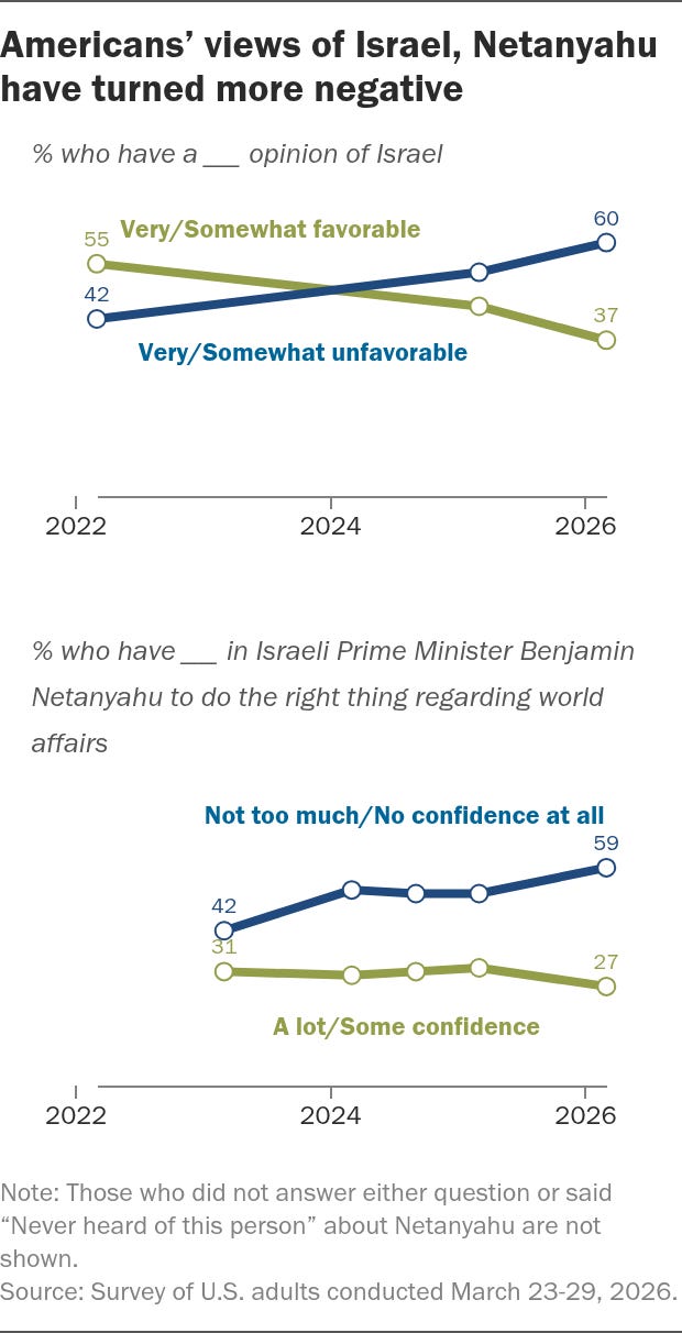 Negative views of Israel, Netanyahu continue to rise among Americans – especially young people Laura Silver, Pew Research Center Americans have increasingly negative views of Israel and its prime minister, Benjamin Netanyahu, according to a new Pew Research Center survey.