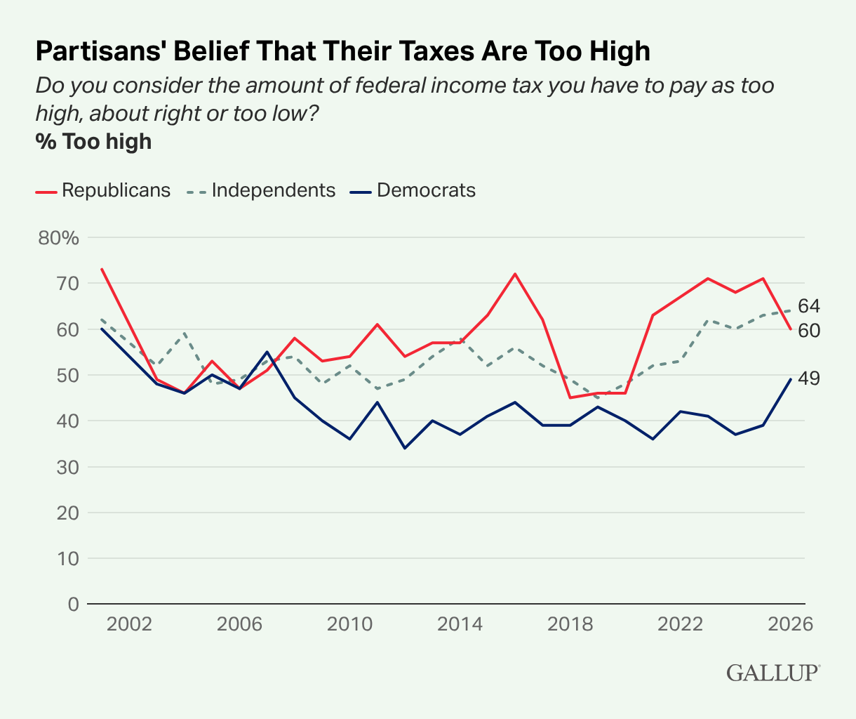 Americans' Tax Views Remain Negative Lydia Saad, Gallup Americans’ views of their taxes have remained near their most negative levels in two decades for the past three years, both in perceptions of the amount paid and whether it is fair. While Republicans’ attitudes have become somewhat more positive during Trump’s second term and Democrats’ more negative, these shifts have offset each other, leaving overall public sentiment largely unchanged.