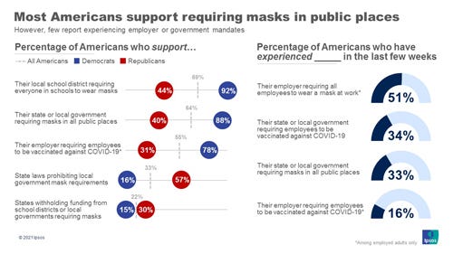 Most Americans support mandating masks in schools and vaccinations to return to the workplace, and they oppose states' efforts to ban such moves, according to the latest installment of the Axios/Ipsos Coronavirus Index. But, but, but: The survey finds the Republican base going against the grain so disproportionately that it helps explain the defiant postures of many red-state governors.