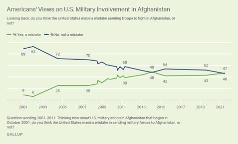 As the U.S. military continues its drawdown of troops in Afghanistan, Americans are evenly divided in their views on whether it was a mistake for the U.S. to send troops into the country nearly 20 years ago. This is in contrast with most of the readings over the past two decades, which have found Americans generally more positive than negative toward the effort there.