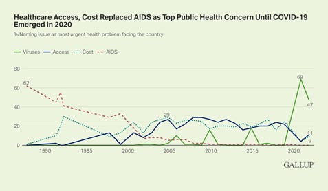 The coronavirus continues to dominate Americans' top-of-mind mentions of what constitutes the most urgent health problem facing the country today, but to a lesser extent than a year ago.