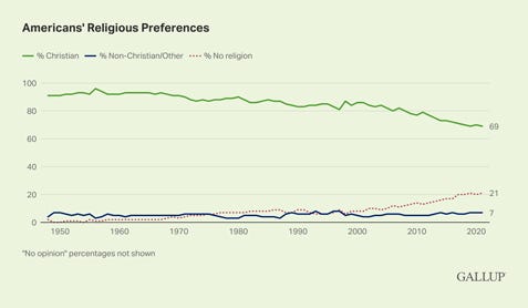 The vast majority of Americans have a religious preference -- predominantly a Christian one -- though that percentage is declining. At the same time, much smaller proportions of Americans say that religion is "very important" to them, that they belong to a church or that they regularly attend religious services.