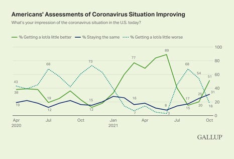 Americans' outlook for the coronavirus pandemic in the U.S. has improved, as the summer surge brought on by the delta variant has waned in most parts of the country. The percentage of Americans who now say the U.S. COVID-19 situation is improving has more than doubled between September and October, to 51%.