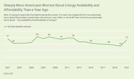 Americans' worry about the U.S. energy situation has risen sharply in the past year to a level not seen in nearly a decade. More than seven in 10 U.S. adults, up from about half last year, say they worry about the availability and affordability of energy.