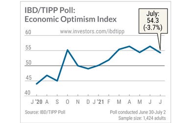The stock market rally pushing the S&P 500 to all-time highs lifted the personal financial outlook among investors to a new record, the July IBD/TIPP Poll finds. Yet rising financial stress, as stimulus fades and inflation percolates, is weighing on U.S. economic optimism.