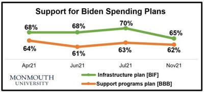 President Joe Biden’s big spending plans on infrastructure, support programs, and climate change remain broadly popular even though he personally does not.
