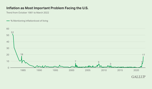 Roughly one in five Americans mention the high cost of living/inflation (17%), or fuel prices (4%) specifically, as the most important problem facing the U.S. today. Together, these account for over half of the economic issues that 35% of Americans cite as the nation's top problem.