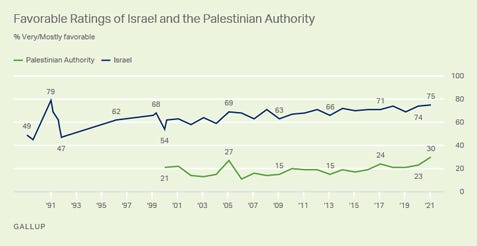 Gallup's annual update of Americans' views on the Palestinian-Israeli conflict shows Israel remains well-liked in the U.S. At the same time, Americans' favorable views of the Palestinian Authority are at a new high of 30%, as is the percentage sympathizing more with the Palestinians than the Israelis (25%).