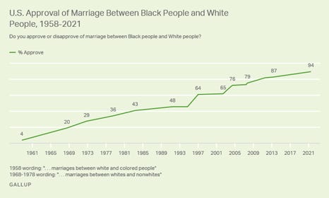 Ninety-four percent of U.S. adults now approve of marriages between Black people and White people, up from 87% in the prior reading from 2013. The current figure marks a new high in Gallup's trend, which spans more than six decades. Just 4% approved when Gallup first asked the question in 1958.