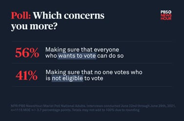 A majority of Americans believe ensuring access to voting is more important than rooting out fraud, the latest NPR/PBS NewsHour/Marist survey finds. At the same time, there was broad agreement that people should have to show identification when they go to the polls. President Biden gets a 50% job approval rating, largely unchanged from last month.