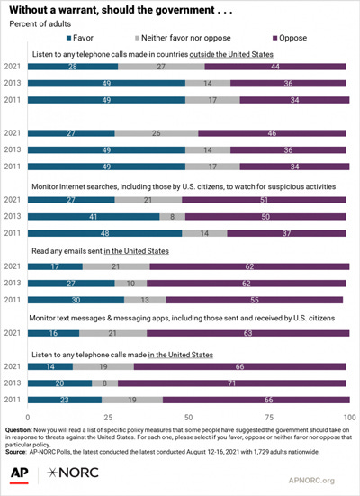 Twenty years after 9/11, less than 3 in 10 adults consider warrantless government analysis of internet activities and communications an acceptable means for monitoring threats against the U.S.