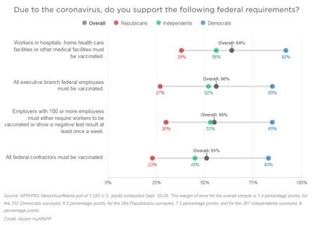 Public support for the Biden administration’s drive to get more people vaccinated for COVID-19 is largely split along partisan lines, according to the latest PBS NewsHour/NPR/Marist poll. While employers in some sectors and parts of the country are reporting that a vast majority of workers are complying with new vaccine requirements, hardened stances among the minority of people who op…