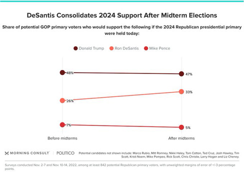 DeSantis Pulls Record-High 2024 Support After Midterms Eli Yokley, Morning Consult 33% of potential 2024 GOP primary voters would back the Florida governor if the 2024 primary were today, up from 26% ahead of the midterms