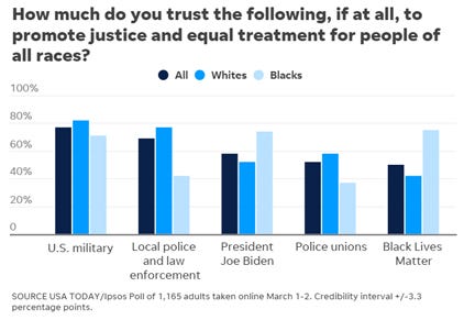 Americans' trust in the Black Lives Matter movement has fallen and their faith in local law enforcement has risen since protests demanding social justice swept the nation last year, according to an exclusive USA TODAY/Ipsos Poll.