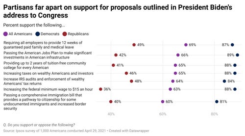 Nearly three-quarters who watched or heard about President Joe Biden’s joint session to Congress approve of the president’s remarks, according to an Ipsos snap poll for Reuters fielded in the hours immediately following the speech. Among all respondents, three in five (or more) support the policies the president outlined in his speech – from 12 weeks of paid family leave to passing the American Jobs Plan – but deep partisan divisions remain, and this support is primarily driven by strong majorities of Democrats backing these policies.