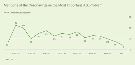 With Americans feeling increasingly optimistic about the coronavirus pandemic, just 8% now mention it as the most important problem in the U.S., the lowest point since it began. The highest percentage citing COVID-19 was 45% in April 2020, which is among the highest recorded by Gallup for any issue.