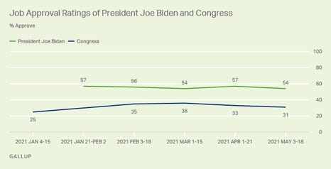Americans' approval ratings of President Joe Biden and the U.S. Congress remain stable at 54% and 31%, respectively. Biden's rating has not varied by more than three percentage points since his inauguration, while the rating for Congress was significantly lower in early January.