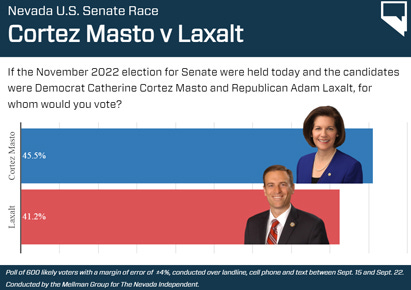 With just over a year to go before the 2022 midterm elections, Democrats at the top of the ticket hold narrow leads over their likely GOP opponents, according to a new poll released Sunday by The Nevada Independent.