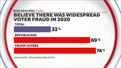 Most Americans don't think there was widespread fraud in 2020, but ever since Joe Biden won, most Republicans say there was. This is connected to the push for further voting restrictions in some states, where making voting easier is seen as giving Democrats an advantage.